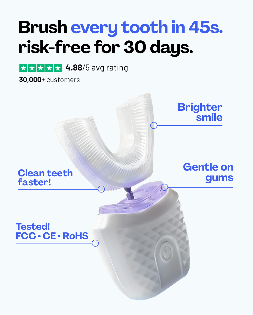 LumoBrush™ uses advanced sonic technology and a U-shaped, BPA-free silicone mouthpiece to clean every tooth at once.