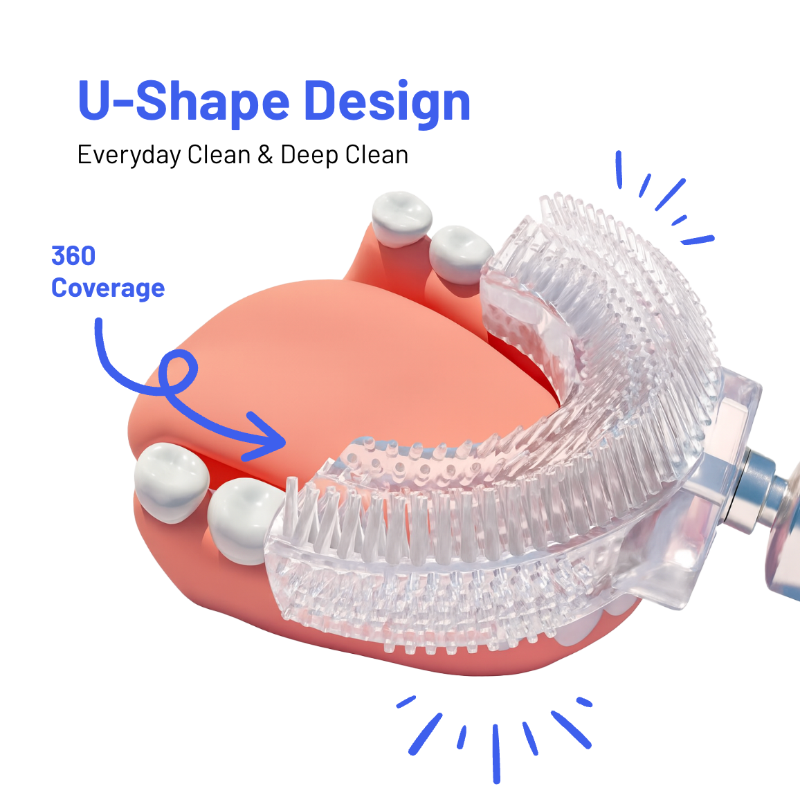 🦷 Brush your whole mouth in 30–45 seconds. The U-shaped, BPA-free silicone head cleans all sides of your teeth at once using gentle sonic vibrations. No scrubbing. No pressure.